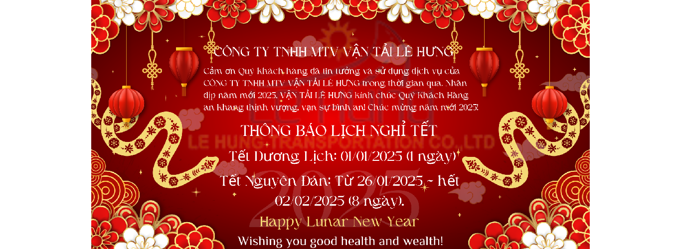 30/12/2024Cảm ơn Quý khách hàng đã tin tưởng và sử dụng dịch vụ của CÔNG TY TNHH MTV VẬN TẢI LÊ HƯNG trong thời gian qua. Nhân dịp năm mới 2025, VẬN TẢI LÊ HƯNG kính chúc Quý Khách Hàng an khang thịnh vượng, vạn sự bình an! Chúc mừng năm mới 2025!